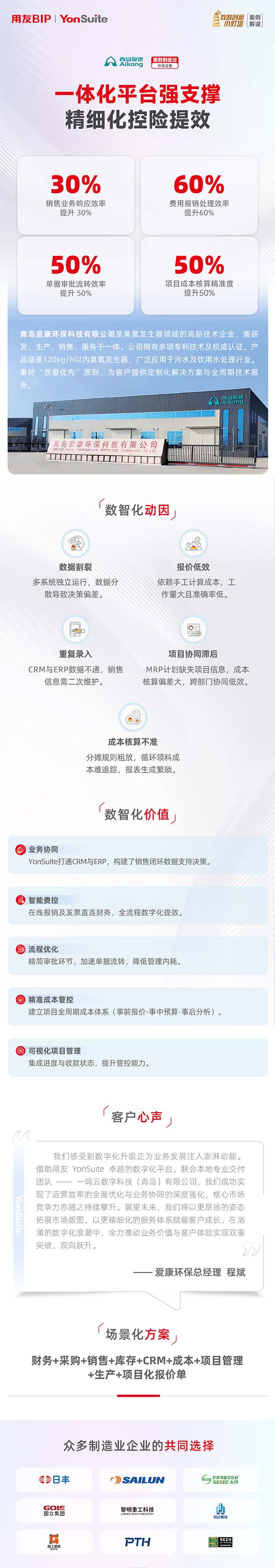 “臭氧發(fā)生器的核心是‘精準(zhǔn)’—— 精準(zhǔn)的臭氧濃度、精準(zhǔn)的反應(yīng)時(shí)間,才能保證水質(zhì)安全。企業(yè)管理也是如此,只有精準(zhǔn)的成本管控、高效的協(xié)同效率,才能支撐企業(yè)持續(xù)發(fā)展。” 愛康環(huán)??偨?jīng)理程斌在談及轉(zhuǎn)型時(shí)感慨道,“YonSuite 為我們注入了‘精準(zhǔn)基因’,讓成本可量化、流程可追蹤、決策有依據(jù)。未來,我們將以更精細(xì)化的管理和更可靠的產(chǎn)品,讓每一臺(tái)臭氧發(fā)生器都成為客戶信賴的‘水質(zhì)衛(wèi)士’。”