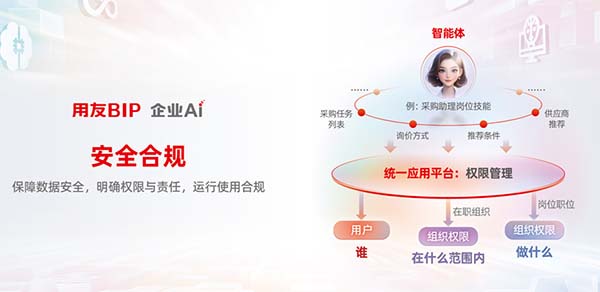 在安全合規(guī)層面,用友BIP通過保障企業(yè)的數(shù)據(jù)安全,對用戶明確權(quán)限與責任,規(guī)范AI應(yīng)用在企業(yè)內(nèi)的使用流程等,保證AI使用符合企業(yè)和國家的相關(guān)法規(guī)。通過接入企業(yè)權(quán)限管理與制度體系,通過針對異構(gòu)系統(tǒng)的技能權(quán)限管理(包括智能體的權(quán)限控制),以及數(shù)據(jù)倉庫的分層權(quán)限控制、加密與脫敏以及訪問通道等,并從技術(shù)架構(gòu)設(shè)計層進行實時行為監(jiān)控、保障安全,以及遵從相關(guān)的倫理合規(guī)等。