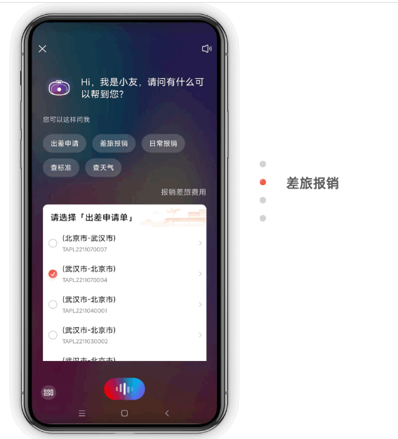 以差旅報銷為例,進入友費控APP后,通過說出“差旅報銷”,即可快速篩選出當前滿足報銷條件的出差申請及待報銷賬單,簡單勾選后即可輕松發(fā)起報銷,全程告別手工輸入,動動嘴全搞定!