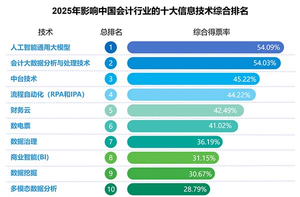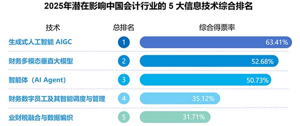 以往評選結(jié)果相對穩(wěn)定,今年卻發(fā)生顯著變化,人工智能通用大模型、多模態(tài)數(shù)據(jù)分析都是第一次出現(xiàn)在榜單中。同時,新一代ERP(曾連續(xù)5年入選)、電子會計檔案(曾連續(xù)8年入選)則退出了榜單。新興技術(shù)以顛覆性姿態(tài)加入,傳統(tǒng)熱門技術(shù)逐漸淡出,這表明會計科技正處于快速變革的關(guān)鍵節(jié)點。