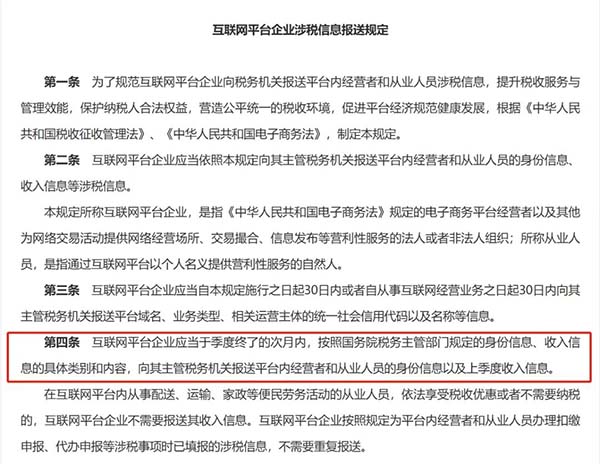 近日,《互聯(lián)網(wǎng)平臺企業(yè)涉稅信息報(bào)送規(guī)定》正式出臺實(shí)施,一石激起千層浪,社會(huì)各界對此廣泛關(guān)注。那么,這項(xiàng)新規(guī)究竟藏著哪些變化?又將對哪些群體產(chǎn)生深遠(yuǎn)影響?