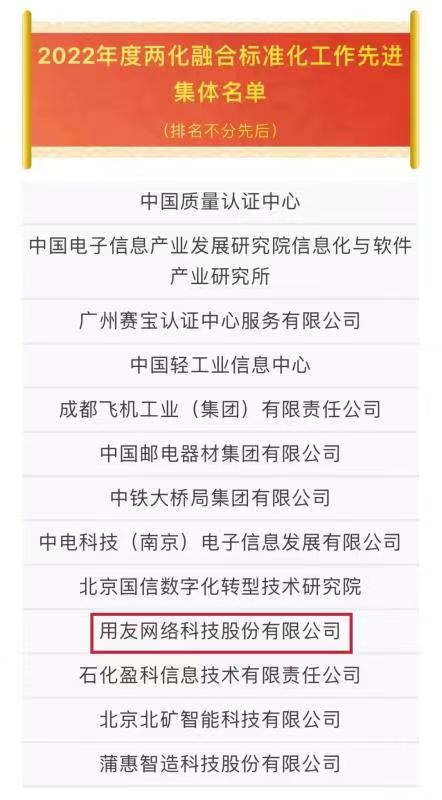 12月20日,全國(guó)兩化融合管理標(biāo)準(zhǔn)化技術(shù)委員會(huì)公布2022年度兩化融合標(biāo)準(zhǔn)化工作先進(jìn)集體、先進(jìn)個(gè)人、標(biāo)準(zhǔn)應(yīng)用先進(jìn)單位名單,用友網(wǎng)絡(luò)科技股份有限公司榮獲2022年度全國(guó)兩化融合標(biāo)準(zhǔn)化工作先進(jìn)集體。