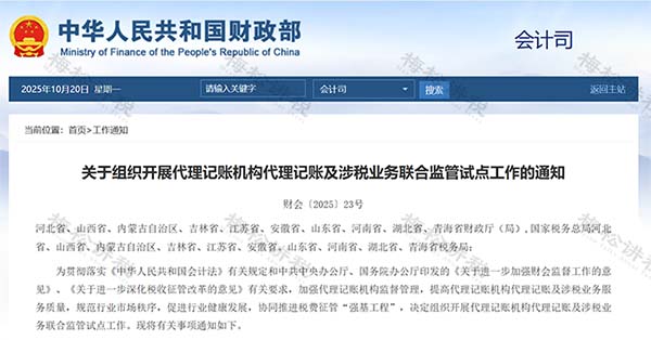 10月17日,財(cái)政部 國家稅務(wù)總局發(fā)布《關(guān)于組織開展代理記賬機(jī)構(gòu)代理記賬及涉稅業(yè)務(wù)聯(lián)合監(jiān)管試點(diǎn)工作的通知》。