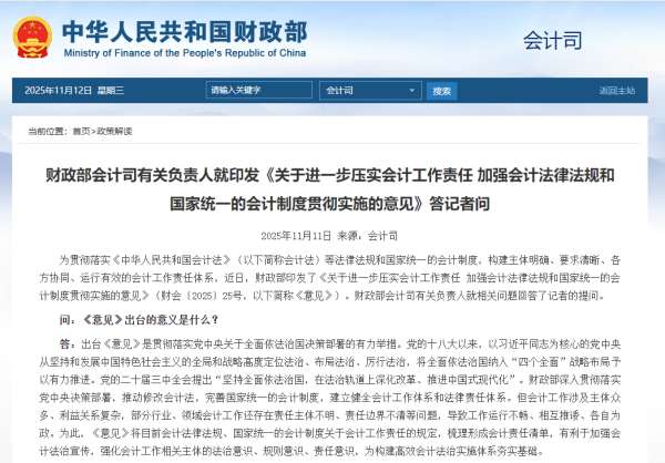 財(cái)政部發(fā)布《關(guān)于進(jìn)一步壓實(shí)會(huì)計(jì)工作責(zé)任 加強(qiáng)會(huì)計(jì)法律法規(guī)和國(guó)家統(tǒng)一的會(huì)計(jì)制度貫徹實(shí)施的意見》(下稱《意見》)。
