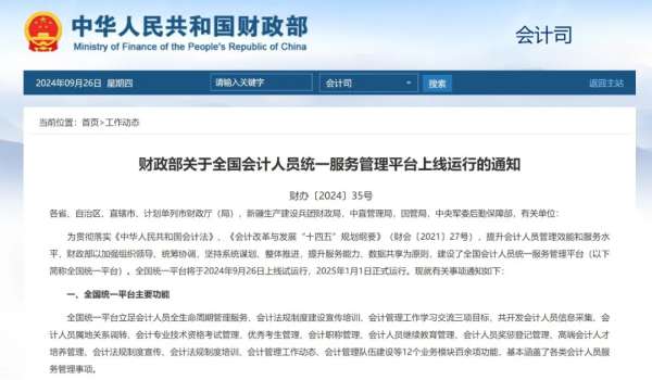 財(cái)政部發(fā)布《關(guān)于全國(guó)會(huì)計(jì)人員統(tǒng)一服務(wù)管理平臺(tái)上線運(yùn)行的通知》。