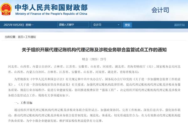 日前,財(cái)政部與國家稅務(wù)總局聯(lián)合發(fā)布《關(guān)于組織開展代理記賬機(jī)構(gòu)代理記賬及涉稅業(yè)務(wù)聯(lián)合監(jiān)管試點(diǎn)工作的通知》(財(cái)會〔2025〕23號),決定在河北、內(nèi)蒙古、江蘇等10個(gè)省份開展代理記賬機(jī)構(gòu)聯(lián)合監(jiān)管試點(diǎn)。