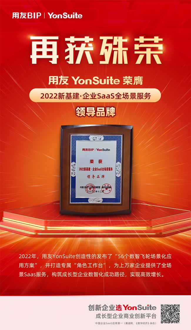 本次評選用友YonSuite榮獲“2022新基建·企業(yè)SaaS全場景服務(wù)領(lǐng)導(dǎo)品牌”,以實(shí)力引領(lǐng)創(chuàng)新,以技術(shù)領(lǐng)先性和創(chuàng)新性驅(qū)動(dòng)企業(yè)高效增長,領(lǐng)跑中國SaaS產(chǎn)業(yè)發(fā)展。