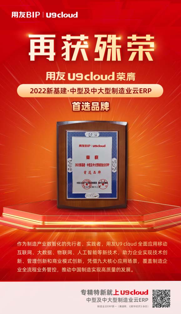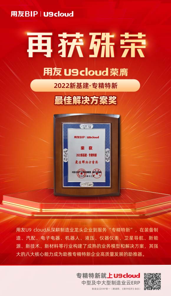 用友U9 cloud榮獲“2022新基建·中型及中大型制造業(yè)云ERP首選品牌”及“2022新基建·專精特新最佳解決方案獎(jiǎng)”兩項(xiàng)表彰。